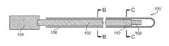 FIG. 7cshows a longitudinal cross section of another embodiment of a probe/catheter with an elongate sheath surrounding a rotational drive shaft, a functional component and a frictional element to create friction between the external sheath and the rotational drive shaft, and in which the rotational drive shaft has a wider diameter in its proximal and mid sections, and a smaller diameter in its distal section such that the frictional element inFIG. 7C also serves as a coupling mechanism to mechanically couple the different sizes of rotational drive shaft seen herein.