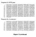 FIG. 12 is a schematic diagram of the chimeric transgene used to generate triple-gene silencing in cotton (MonoCott construct). DNA sequences of the fragments labelled on the top of the construct are detailed inFIG. 11. (Abbreviations: LB: T-DNA left border; LecP: soybean lectin promoter; ghFAD2-1: cotton microsomal oleoyl Δ12 desaturase cDNA; ghCPA-FAS-2: cotton cyclopropane fatty acid synthase; ghFatB-1: cotton palmitoyl-ACP thioesterase; lec-T: soybean lectin terminator; RB2: T-DNA right border 2; S1: subterranean cloverstunt virus segment 1 promoter; S3: subterranean cloverstunt virus segment 3 terminator; NPTII: neomycin phosphotransferase gene. The sizes of the full length cDNA and the selected fragments of each target gene in making the RNAi construct were also indicated).