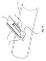 With reference toFIGS. 76 and 77, in conjunction withFIG. 51, one embodiment of needle/suture subassembly is illustrated attached to a distal end of adriver312. In this particular embodiment,needle tip108, withsuture104 attached thereto, punctures the vessel wall during an operation and penetrates the foot and ribbons. This embodiment also incorporates a keying feature, which engages with a slot in the needle driver tube. This feature ensures orientation of the needle-tip and suture relative to the needle driver and prevents damage to the suture or suture/needle junction during assembly, deployment and ejection. The ramped back profile on the needle tip is designed to allow room for the suture to fold down to protect it from any shearing action during the firing through arterial wall andintra-arterial foot102. Folding of the suture should also help to minimize the penetration force when passing through the arterial wall.