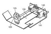 The feed-through coil arrangement has, in the example, an essentiallycylindrical housing113 into which the feed-throughcoil112 and further components of the feed-through coil arrangement are permanently integrated. Some examples are explained in more detail below inFIGS. 3 to 5. The securingdevice120 comprises acoil holder125 with a cylindrical through-opening126 which can be widened to a limited degree and into which the feed-through coil arrangement can be introduced axially to be subsequently secured in the coil holder by tightening clamping screws. The coil holder is connected to abase element140 of the securing device via a single flexible connecting element in the form of a connectingwire130, whichbase element140 comprises abase plate141 which can be attached to the upper side of thecomponent121 using screws.
