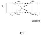 In a MIMO system the transmitter sends multiple streams from multiple base antennas. The transmitted streams define a number of paths between the base antennas at the transmitter and the device antennas at the receiver. The transmit streams may be represented as a matrix as illustrated inFIG. 1, asimple MIMO system30 having atransmitter32 with twobase antennas36A,36B andreceiver34 with twodevice antennas38A,38B which together define four transmission paths. System throughput is in a MIMO system is multiplied nearly linearly with every additional antenna. For example a 2×2 MIMO system as shown inFIG. 3 will approximately double throughput. Full throughput enhancement in a MIMO system is only achieved however, if the additional antennas transmit in uncorrelated Rayleigh fading channels. Thus, most effective MIMO transmission requires that the paths between antennas be de-correlated