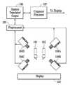 A block diagram of an embodiment of the invention is illustrated inFIG. 1. A user locates hishands101 and102 in the viewing area of an array ofcameras104A-104D. The cameras detect location, orientation, and movement of the fingers andhands101 and102 and generate output signals to pre-processor105. Pre-processor105 translates the camera output into a gesture signal that is provided to thecomputer processing unit107 of the system. Thecomputer107 uses the input information to generate a command to control one or more on screen cursors and provides video output to display103.