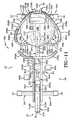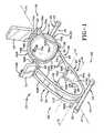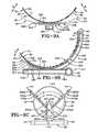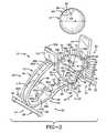 With primary reference toFIGS. 7,9A,9B and12,ball support238 is now described in greater detail.Support238 includes a first orbottom plate320 and a second ortop plate322 each of which is curved as viewed from the side. In the exemplary embodiment,bottom plate320 is formed of a rigid material such as steel or another metal. However,plate320 is sufficiently thin to allow for some flexing as described further below.Bottom plate320 is typically formed of a spring metal.Top plate322 is in the exemplary embodiment formed of a material which is less rigid than the material ofbottom plate320. In the exemplary embodiment,top plate322 is formed of a fairly rigid and resilient plastic which thus also allows for some flexibility and, likeplate320, the ability to return to its original position once the force causing it to flex has been removed.Bottom plate320 has front and back axially elongated parallel ends oredges324 and326. Back edge326 in the exemplary embodiment is rearward of and higher thanfront edge324.Plate320 also has left and right longitudinally elongatedparallel edges328 and330 extending from thefront edge324 to backedge326 and intersecting the front and back edges at respective right angled corners.Edges324,326,328 and330 thus form an outer perimeter ofplate320 as viewed from below (FIG. 12).Bottom plate320 has a downwardly facingbottom surface332 and an upwardly facingtop surface334 each of which extends fromfront edge324 to backedge326 and fromleft edge328 toright edge330. As shown inFIG. 9A,bottom plate320 and thus its lower andupper surfaces332 and334 are straight and horizontal as viewed in a cross section looking forward. As viewed from the side (FIGS. 7,8,9B),bottom surface332 is convexly curved fromfront edge324 to backedge326 and forms an arc of a circle which is concentric about center X ofsphere12. As viewed from the side,top surface334 is concavely curved fromfront edge324 to backedge326 and lies along an arc of a slightly smaller diameter circle which is concentric about center X. The radius of curvature ofbottom surface332 is substantially the same as that offront surface253 of each support member235.