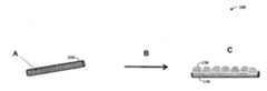 Turning now to the Figures,FIG. 1 shows ananostructure100 at various stages of a doping process, according to another example embodiment of the present invention. Ananotube110 at A is shown by way of example, while the approach shown and described as follows can be used in connection with a variety of nanostructures or microstructures, as discussed above. For example, one or more of CNTs, single-walled nanotubes (SWNTs), multi-walled carbon nanotubes (MWCNTs), carbon fibers, nanowires, nanomaterial tows, and nanomaterial ropes (e.g., bundles of ranging diameter) can be formed as shown. Different types of nanomaterials may also be used, such as those discussed above, nanotubes with varying chirality (e.g., semiconducting or metallic), semiconducting nanotubes, metallic nanotubes, inorganic and organic nanowire (e.g., with one or more of ZnO, Ag, Au or Si), or a combination thereof. In addition, while onenanotube110 is shown, a multitude of such nanotubes (or nanostructures) can be doped as described herein, concurrently and/or as part of different manufacturing steps.