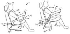 In a case of restraint, theseat belt system8 shown here functions like a conventional three-point seat belt. Belt tensioning can be performed by the two ends32,34 of theseat belt30, while theportion36 of theseat belt30 is safely held at thewebbing catcher10 or theseat belt30 is deflected by thewebbing catcher10. As the lines ofaction40,42 of the webbing forces extend near thepivot point14, as is visible inFIG. 5, moreover no transfer of high moment loads by the seat belt to thewebbing catcher10 is possible so that thewebbing catcher10 can be fixed in the retaining position with a relatively low retaining force.