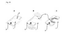 FIG. 12 shows the interaction of the information carrier with the detection device, especially the touch screen of the detection device. Auser10 can place theinformation carrier1 comprising aregion3, to generate a touch event on thetouch screen9 of adetection device8 and holding theinformation carrier1 simultaneously. However, it may also preferred, that theinformation carrier1 is placed on thetouch screen9 without being hold by theuser10. Theinformation carrier1 can have various sizes in relation to the touch screen9 (seeFIG. 13A-C). It1 can be smaller than, equal to or bigger than thetouch screen9. The size does not matter for an interaction to occur. It may only render the way of the interaction. If theinformation carrier1 is bigger than thetouch screen9, it may be advantageous to move thedetection device8 over theinformation carrier1. However, it is also possible to move theinformation carrier1 relative to thedetection device8. In this context, it may be advantageous if theinformation carrier1 or thedetection device8 is stationary, whereas the other is mobile (see e.g.FIG. 14A-C). The static one can be aligned in a vertical or horizontal orientation, allowing the user to use either theinformation carrier1 or thedetection device8 while standing or sitting (see e.g.FIG. 15A-C). It is preferred that theinformation carrier1 is printed on an object or that the object is the substrate for the information carrier1 (seeFIG. 16A-C). The object carrying theinformation carrier1 can be moved over adetection device8, that can be oriented in a horizontal or vertical way. Theinformation carrier1 can also be scant by adetection device8, wherein thedetection device8 is moved over the information carrier1 (seeFIG. 16A-F), when the information carrier is positioned on or at asurface12. Thesurface12 can be part of a bigger object as well.