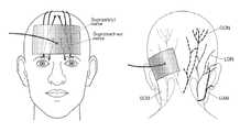 FIG. 5 Anatomical landmarks depicting the areas of other positioning of TES electrodes for stimulating the branches of the trigeminal, greater occipital and lesser occipital nerves. Modified from Pinosky M L et al. Anesth Analg 1996; 83: 1256-61. The supraorbital nerve is a branch of the first (V1) division of the trigeminal nerve; the zygomaticotemporal nerve is the terminal branch of the second (V2) division of the trigeminal nerve; the auriculotemporal nerve is the terminal branch of the mandibular nerve (V3division of the trigeminal nerve).