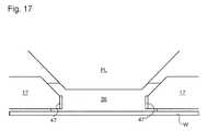 FIG. 17 shows one possible arrangement, whereinultrasonic transducers47 are located on theseal member17 and may couple directly to the liquid between the final element of the projection system PL and the substrate W. To minimize the risk of altering the position of the projection system itself during cleaning, thetransducers47 may be mechanically isolated from, or at least in damped connection with, theseal member17. For example, thetransducers47 may be located nearby, rather than on, theseal member17. Alternatively, the device connection to the projection system PL may be mechanically released when the high frequency is generated. In the context of projection system or substrate table cleaning, a wide variety of high frequency generators may be used that produce ultrasonic waves resonant with the immersion liquid. In practice, the ultrasonic projection system and substrate table cleaning action may be implemented automatically and be arranged to cycle on and off according to the rate of contamination.