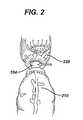 The anastomosis can be performed by a variety of techniques known in the art. In one exemplary technique, low anastomosis of colon to rectum using the anastomotic stapler is performed. Briefly, and referring toFIGS. 2 and 3A, afterstapler50 is inserted through the anus (not shown), the descendingcolon210 is fixated aroundanvil100 with purse string sutures tied around theshaft104 and therectal stump220 is fixated around staplinghead60 with purse string sutures also tied around theshaft104 resulting in the assembly shown in FIGS.2 and3A-C. Anvil100 is then pulled towards staplinghead60 as schematically shown inFIG. 3B, and then thestaples90 are deployed to join the tissue of the descendingcolon210 andrectal stump220 at their respective serosal surfaces, with simultaneous action of circular scalpel (not shown) within the stapler cutting away excessive tissue (inverted bowel) closest toshaft104, resulting in anastomosis as shown inFIG. 3C.Stapler50 is then removed resulting in anastomotic joint as shown inFIG. 3D. The diameter of theshaft104 is shown schematically inFIG. 3D by arrows.