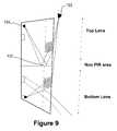 FIG. 9 is a schematic break-away side view of a dual optics passive infrared motion detector in which an external light source passes through and redirected by anti-masking patches, and is further reflected by an internal reflector onto one of the sensors,