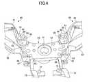 The fastenedparts24 are formed at the right and leftside parts21cof theframe21 so as to protrude toward the vehicle front. A pair of fixingparts24, having a substantially rectangular plate shape, are formed in the present embodiment. The fastenedparts24 are fastened to the fixingparts88 of thehub80. Each fastenedpart24 includes the fixingnut25 having an internal thread and protruding toward the central portion of the hub80 (seeFIG. 3).