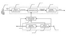 SUMMARYIn various embodiments, the present invention is directed to a real-time open domain speech translation system for simultaneous translation of a spoken presentation that is a spoken monologue comprising one of a lecture, a speech, a presentation, a colloquium, and a seminar. The system includes an automatic speech recognition unit configured for accepting sound comprising the spoken presentation by a speaker in a first language. The system may also include a resegmentation unit for continuously creating word hypotheses of the spoken presentation in real time while the speaker is speaking, merging at least two partial hypothesis of recognized speech by the speaker, and resegmenting the merged partial hypothesis in a translatable segment. Segment boundaries for the translatable segments may be determined using back channel information (e.g., sound) from a listener (or listeners) of the presentation. The system may also comprise a machine translation unit that translates the translatable segment into a second language.