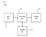 Input unit110 receives data from an outside and transfers the data intoinformation processing device100. A user may input intoinput unit110, for example, characters, or a command for starting applications stored ininformation processing device100, or select one of options of a graphical user interface (GUI) ondisplay unit130.Input unit110 may include a touch sensing unit (not shown) that generates touch information in response to user's touch and transmits the generated information toprocessing unit120. Touch sensing unit may include a touch pad or a touch screen. The touch sensing unit detects the position where a user makes touch, as well as the presence of the touch. In one embodiment, the touch sensing unit may be integrated intodisplay unit130, but its implementation is not limited thereto. In some embodiments,input unit110 may further include a keyboard and/or a mouse.