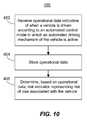 In some embodiments, themethod400 includes additional blocks not shown inFIG. 10. In one embodiment where the operational data is received at a unit arranged within the vehicle, for example, themethod400 also causes data representing the determined risk indicator to be wirelessly transmitted from the vehicle to a server, where the data may then be used to determine an insurance rating and/or premium associated with the vehicle. In another embodiment, themethod400 also receives sensor data representing information collected by a sensor that is located on or in the vehicle and configured to sense an environment external to the vehicle (e.g., similar to block202 of method200). In this embodiment, themethod400 further stores the received sensor data in a memory, and the risk indicator is determined based not only on the operational data, but also the stored sensor data (e.g., in a manner similar to that discussed above in connection withmethod360 ofFIG. 9).