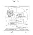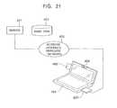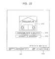InFIG. 21, theserver401 is similar to the WWW server inFIG. 13, and includes a main unit computer (server401), thehard disk402 for storing information of, e.g., bulletin boards corresponding to respective positions in the real world, a network connecting device (not shown) for connecting theserver401 to thenetwork403, etc.