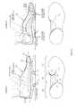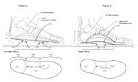 FIGS. 11-12 further show how the principles of a dynamic arch work with the invention.FIG. 11 shows the human foot with a neutral arch and in a condition with superior arch compression.FIG. 12 shows inferior arch compression occurring in the foot during the heel-off phase without the invention and during mid-stance phase with the invention according to the embodiment shown inFIG. 3A with the wedges on the outsole along the medial arch.