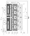 There are many alternative embodiments possible. By way of example, the cathode and ground signals S1, S3, S4 of theHC cavities108, could be arranged such that the signal S1 could be applied to an optionalconductive layer116A that extends over the top of the HC cavities. Other variations are also possible in the gas feed geometry, since twoseparate gases128,140 are supplied to thewafer processing region106 at substantially alternating points over the array.