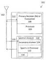 For example,FIGS. 1A and 1B schematically illustrate two generic variations of devices that include a primary receiver (or a receiver portion of a transmitter) that is used to receive wireless data and operates at one or more frequency channels within an operating band; these devices also include a secondary receiver that, in conjunction with a secondary processor, simultaneously scans the frequency spectrum of the operating band.