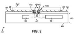 In configurations of the type shown inFIG. 2,antenna structures30,shield layer38, and packagedcircuitry40 may form an integrated wireless structure on printedcircuit42 and may therefore sometimes be referred to as a circuit module. Integrated circuit modules of this type may be provided with any suitable type of antenna structures, shields, and packaged circuits. For example,antenna structures30 may contain inverted-F antenna structures, planar inverted-F antenna structures, monopole antenna structures, dipole antenna structures, patch antenna structures, structures associated with a loop antenna, or other antenna structures.Antenna structures30 may be formed from a ceramic antenna structure (i.e., a ceramic chip antenna), a flexible printed circuit with antenna traces, a rigid printed circuit with antenna traces, a plastic carrier covered with traces that have been patterned using laser direct structuring or other patterning techniques, or other dielectric support structures.Shield layer38 may be formed from one or more layers of metal or other conductive materials. The layers of metal may be formed from sheets of metal foil, from metal coatings on polymer layers, or from other metal layers. Packagedcircuitry40 may be formed from circuitry such as one or more integrated circuits (i.e., an integrated circuit die formed from a piece of silicon that has been thinned to a thickness of less than 500 microns, less than 200 microns, less than 75 microns, or other suitable thickness) and other electrical components that are embedded in an insulating structure. The insulating structure may be a printed circuit substrate (e.g., a multilayer printed circuit substrate), circuitry that is packaged in a molded plastic encapsulant structure, or circuitry that is packaged in other suitable packages (e.g., surface mount technology packages, etc.).