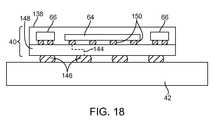 As shown inFIG. 18, packagedcircuitry40 may include solder balls such assolder balls150.Electrical components64 and66 may be embedded within dielectric material such as molded plastic138 on printedcircuit148.Solder balls150 may be used to mountcomponents64 and66 on printedcircuit148 in a flip-chip configuration in whichcomponents64 and66 are mounted face down so that pads on the surface ofcomponents64 and66 may be soldered to corresponding pads on the surface of printedcircuit148.Solder balls146 may be used to interconnecttraces144 in packagedcircuitry40 to traces in printedcircuit42.