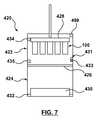 Once bothchambers422,424 are at or near solvent vapor saturation, capillary filling may be initiated by movingstents100 into contact with or submersed into wicking means430 as shown instep301E ofFIG. 3 and as shown inFIG. 6. Wicking means430 is in contact withfluid drug formulation432, to control transfer of the fluid drug formulation intolumen103 ofhollow wire102 ofstent100. In one embodiment, wicking means430 is an open-celled polyurethane sponge or foam although various alternative embodiments of the wicking means are discussed herein.Stents100 are pushed into or onto wicking means430, thereby deforming wicking means430. As the wicking means deforms, wicking means430 transfersfluid drug formulation432 fromlower chamber424 into submersedholes104 ofstent100.Lumen103 ofhollow wire102 ofstent100 is filled by surface tension drivingfluid drug formulation432 through the stent lumen, until the entire length oflumen103 is filled via capillary action forces, as shown instep301F ofFIG. 3. During the filling step,chambers422,424 are maintained at or near the vapor-liquid equilibrium of solvent433 such that evaporation does not precipitate therapeutic substance ordrug112 asfluid drug formulation432 fills lumen103 ofhollow wire102 ofstents100.