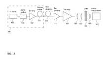 FIG. 13 is an illustration of an embodiment in which a pulse picker, a preamplifier, and a pulse compressor at the frequency doubled wavelength are added to the embodiment shown inFIG. 8.