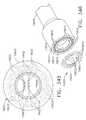 In various embodiments, referring now toFIGS. 347 and 348, a flexibletissue thickness compensator15720 can comprise a circular or annular flexibleouter ring15724, for example. In certain embodiments, theouter ring15724 may be configured such that it is not captured within staples deployed from thesurgical stapler15600; rather, in at least one embodiment, theouter ring15724 may be positioned radially outwardly with respect to the outer row ofstaple cavities15613. In at least one such embodiment, thetissue thickness compensator15720 can comprise a plurality of tags, such asinner tags15622 andouter tags15623, for example, extending therefrom such that the tags can be at least partially captured within the staples as they are being deformed. More particularly, referring primarily toFIG. 347, eachinner tag15622 can comprise a head which is positioned over astaple cavity15612 defined in thesurgical stapler15600 wherein the head can be attached to theouter ring15724 by aneck15726, for example, and, similarly, eachouter tag15623 can comprise a head which is positioned over astaple cavity15613 defined in thesurgical stapler15600 wherein the head can be attached to theouter ring15724 by aneck15727, for example. In various embodiments, the heads of theinner tags15622 and theouter tags15623 can comprise any suitable shape, such as round, oval, and/or elliptical, for example. Thenecks15726 and/or15727 can also comprise any suitable shape wherein, in at least one embodiment, thenecks15726 connecting the heads of theinner tags15622 to theouter ring15724 can be configured to extend between adjacent outerstaple cavities15613 such that thenecks15726 are not captured within the staples deployed from theouter staple cavities15613. In certain alternative embodiments, a tissue thickness compensator can comprise a circular or annular flexible inner ring, a circular or annular flexible outer ring, and, in addition, a plurality of tags which can be connected to the inner ring and/or the outer ring. In at least one embodiment, certain tags can be connected to the inner ring and certain other tags can be connected to the outer ring. In certain embodiments, at least some of the tags can be connected to both the inner ring and the outer ring. In any event, further to the above, theinner ring15624 of thetissue thickness compensator15620, theouter ring15724 of thetissue thickness compensator15720, and/or any other suitable tissue thickness compensator, can be configured to resiliently expand and/or contract in order to accommodate the expansion and/or contraction of the tissue that it has been implanted against. Furthermore, although various embodiments are described herein as comprising circular or annular support rings, a tissue thickness compensator can comprise any suitably-shaped support structure for connecting the tags thereto. In various embodiments, further to the above, the circular knife advanced by the surgical stapler to cut the tissue captured between the anvil and the support portion can also cut the buttress material. In at least one such embodiment, the knife can separate the inner support ring from the tags by cutting the necks thereof, for example.