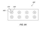 Atoperation500 depicted inFIG. 5, a light-transmissive resin sheet is provided with cavities for receiving light sources.FIG. 6A shows a top view of one example of a light-transmissive resin sheet for use in the process for making the lighting device. Light-transmissive resin sheet600 includes a plurality ofcavities610. Each cavity includes acylindrical hole620 andcounterbore630.Cavities610 can be dimensioned so that only one vertex of a light source can be inserted intocylindrical hole620.Cavities610 may have the same or different dimensions. The light-transmissive resin sheet can have generally the same characteristics as those disclosed with regard to the light device. The cavities may be formed, for example, using standard drilling, imprinting, or molding procedures.