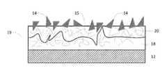 As shown in theFIG. 1, a portion of the fibrillatedfibers15 may extend through thefrontfill18 or may be entirely encapsulated by thefrontfill material18. In either case, the fibrillatedfibers15 form extensions or protrusions in the surface of the frontfill layer. The protrusions tend to form ahigh peaks16 anddeep holes13 that extend above and below the averagemean plane19 of the frontfill layer.FIGS. 5 and 6 show images contrasting the extensions in a control sample frontfill having no fibrillated fibers (FIG. 5) and a frontfill sample having fibrillated fibers (FIG. 6). The samples that were the subject of the images ofFIGS. 5 and 6 in particular included backing that was a cloth material and fibrillated fibers that included 0.7 wt % pre-opened Kevlar® pulp, which will be described further herein. It should be understood, however, that fibrillated fibers useful in embodiments of the present invention can include natural, synthetic, organic, inorganic, polymeric, aramid, poly-aramid, polypropylene, acrylic, and cellulose fibrillated fibers.