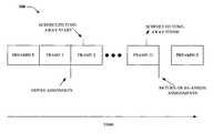 Referring now toFIG. 3, an exemplary timing diagram300 associated with a tune-away is illustrated. The timing diagram300 illustrates initiation of a tune-away as well as completion of a tune-away. In more detail, if a tune-away is scheduled to begin at a middle of a frame, then the tune-away should initiate at a frame boundary just prior to the scheduled beginning of such tune-away. Similarly, if the tune-away is scheduled to end at a middle of a frame, the tune-away should complete at an end of a frame. In the exemplary timing diagram300, the tune-away is scheduled to initiate at a middle offrame2 and end at a middle offrame11. However, resource assignments associated with an access terminal and an access point can expire and may be re-assigned, respectively, at a beginning offrame2 and at frame12. There may be a minimum and/or maximum time allowed for a tune-away, and time corrections can be made with respect to an access point and an access terminal if desirable.