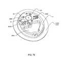 Referring now toFIG. 75, thedevice10 is shown in another view where more elements are visible. InFIG. 75, thedevice10 is shown with base disposable portion Y including a coiledmicrotubing flow restrictor340 and afluid line310 connecting theinlet21 andoutlet22 valves. The pumpingactuation member54 is also shown. The top X includes amain PCB13, avibration motor3210, twomicrophones133, aspeaker134, areference chamber127 and a fixedvolume chamber129. Abattery15 is also shown. Since choosing a very small diameter for theflow restrictor340, may cause occlusion of the line310 (for example, due to protein aggregates in a therapeutic fluid), it may be desirable to use a longer length of tubing with a larger diameter. However, in order to pack a longer length of tubing within a patch-sized housing, it may be necessary to bend the tubing in to form a tortuous path, e.g, a coiled or serpentine shape.