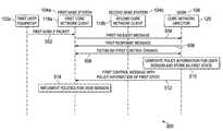 First base station104aincludes a first corenetwork client component118a, andsecond base station104bincludes a second corenetwork client component118b. GGSN/PGW108 includes a corenetwork director component120. In accordance with various embodiments, each of first corenetwork client component118a, second corenetwork client component118b, and corenetwork director component120 may include one or more software components, one or more hardware components, or a combination of software and hardware components. First corenetwork client component118ais in communication with corenetwork director component120 using afirst control channel122aestablished between first corenetwork client component118aand corenetwork director component120. Similarly, second corenetwork client component118bis in communication with corenetwork director component120 using asecond control channel122bestablished between second corenetwork client component118band corenetwork director component120. In one or more embodiments,first control channel122aandsecond control channel122bare each an out-of-band channel established between the respective core network clients118a-118band corenetwork director component120. In still other embodiments,first control channel122aandsecond control channel122bare in-band channels. In accordance with various embodiments,core network director120 is configured to send policy information regarding a subscriber to first corenetwork client component118aand second corenetwork client component118bover thefirst control channel122aand the second control channel, respectively. First corenetwork client component118aand second corenetwork client component118bmay then implement the one or more policies conveyed by the policy information within the RAN upon data associated with a subscriber as will be further described herein.