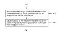 The method ofFIG. 4 includes a switchingstep402. At switchingstep402, a shared media session is automatically switched from a teleconference to a virtual universe based on an analysis of the tracked participation. For example, if an analysis of the tracked participation determines that the participants of the shared media session require a forum to hold multiple conversations concurrently, the shared media session may be switched to a virtual universe in order to allow multiple conversations. In an embodiment, participation is tracked for a number of the participants and analysis of the tracked participation for all these participants leads to such a determination. After switchingstep402 is completed, the method continues to adjustingstep404.