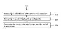 The method ofFIG. 3 includes an accessingstep302. At accessingstep302, an attendee list is accessed for the shared media session in the electronic calendar. In an embodiment, a first identity is determined based on the accessed attendee list. For example, an attendee list of a calendar entry for the shared media session is used to restrict voice samples stored in a database to only the stored voices of the attendees to determine an individual identification. Thus, speaker identification confidence can be improved, for example, in a noisy environment with overlapping speech. After accessingstep302 is completed, the method continues to monitoringstep304. At monitoringstep304, voices for the plurality of participants are monitored. After monitoringstep304 is completed, the method continues to comparingstep306. At comparingstep306, the monitored voices are compared to voice samples stored in a database. In an embodiment, a first identity is determined based on the comparison.