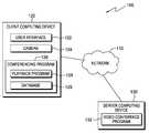 Conferencing program126 can be any platform that can host a live video conference onclient computing device120 allowing a user of the client computing device to communicate with participants in the live video conference in other locations by two-way video and audio transmissions. For example,conferencing program126 may be Lotus Live, Google Hangouts, Facebook video chat, Skype, Google video chat, or any program capable of hosting a video conference onclient computing device120.Conferencing program126 can connect to other participants in a live video conference using a video conferencing program vianetwork110, such asvideo conference program132 onserver computing device130.