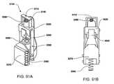 Referring now toFIGS. 92G-92H, an inserting cartridge bolt locking mechanism for use with an inserter, such as the one shown inFIGS. 91A-92F, as5100 is shown. The cartridge bolt locking mechanism can function as an interlock to prevent accidental firing while the mechanism is being cocked. The locking mechanism includes acatch5420, which when engaged in acatch recess5410, prevents downward movement of thecartridge bolt5380. As shown inFIG. 92G, when the cockinglever5145 is in a closed position, the cockinglever5145 contacts acatch lever5440, which rotates thecatch5420 and prevents thecatch5420 from inserting into thecatch recess5410. Acatch spring5430, disposed between thecatch5420 and acatch spring support5450, is in a compressed positioned. Thecartridge bolt5380 and triggerhammer5340 are free to move. As shown inFIG. 92H, when the cockinglever5145 is rotated into a downward position, thecatch lever5440 is released, thereby allowing thecatch spring5430 to force thecatch5420 to insert into the recess (here thecatch5420 is shown inside the recess, but the recess is shown inFIG. 92G as5410); downward movement of thecartridge bolt5380 is thereby prevented. Return of the cockinglever5145 then returns thecatch5420 to an unlocked position. Thecartridge bolt5380 is then free for downward movement in the triggering process.