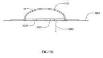 FIG. 96 schematically shows a sectional view of afluid delivery device10, with an insertedcannula5010, held securely under anadhesive patch3100. Apad3220 may be included between thedevice10 and a patient'sskin3250 and allow air to flow to the skin. Air flow to skin may be increased by the inclusion ofpassageways3230 in thepad3220.Passageways3230 may also be formed by using multiple pads that are spaced apart or by constructingpad3220 from a highly porous material. Thus, thepad3220 can be any shape and size and in some embodiments, thepad3220 is made up of a number of separate pieces.Pads3220 may be either adhered to the underside of thedevice10 during manufacture or may be adhered to thedevice10 by a user. Alternately, thepad3220 may be loosely placed onto the skin by a user prior to application of theadhesive patch3100. Thepad3220 may include a compliant material, such as porous polymeric foam.