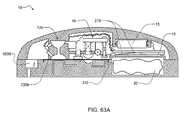 Referring now toFIG. 75, thedevice10 is shown in another view where more elements are visible. InFIG. 75, thedevice10 is shown with base disposable portion Y including a coiledmicrotubing flow restrictor340 and afluid line310 connecting theinlet21 andoutlet22 valves. The pumpingactuation member54 is also shown. The top X includes amain PCB13, avibration motor3210, twomicrophones133, aspeaker134, areference chamber127 and a fixedvolume chamber129. Abattery15 is also shown. Since choosing a very small diameter for theflow restrictor340, may cause occlusion of the line310 (for example, due to protein aggregates in a therapeutic fluid), it may be desirable to use a longer length of tubing with a larger diameter. However, in order to pack a longer length of tubing within a patch-sized housing, it may be necessary to bend the tubing in to form a tortuous path, e.g, a coiled or serpentine shape.