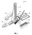 FIG. 23A is an end perspective view of a pipe feeding mechanism in accord with one possible embodiment of the invention. In this embodiment,pipe tub400 comprises a rack or support, at least a portion of which is sloped downward towardscatwalk segment311 which urges pipe towardspipe feed receptacle424.Pipe feed receptacle424 is movably mounted to supportarms434 for transporting pipe betweenpipe tub400 andcatwalk segment311. Accordingly, in one embodiment,pipe receptacle424 lifts pipe one at a time out ofpipe tub400 ontocatwalk311 and/orcatwalk moving elements314. As used hereinpipe tube400 may comprise a volume in which multiple layers of pipe may be conveniently carried or may simply be a pipe rack with a single layer of pipe.