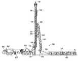 FIG. 28B depicts longlateral completion system10 in accord with one possible embodiment of the present invention.Rig carrier600 is shown withmast assembly100 in an upright position.Mast assembly100 extends past a rear portion ofrig carrier600 so that top drive unit mounted withinmast assembly100 is positioned directly abovefirst wellhead12 for drilling operations, as discussed hereinbefore. In other embodiments, sensors such as laser sights or guides mounted to the rear ofrig carrier600, and the like may be utilized, e.g., mounted to and/or guided to the well head, to locate and orient the axis ofmast assembly100 precisely with respect to the wellbore offirst wellhead12.