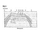 The significant locations of the tooth meshing can be identified, for example, in the form of peaks or edges in the oscillation signal. The load present causes the tooth meshing duration to change in a characteristic manner. The total meshing duration, in other words the time between the starting point of meshing A and the end point of meshing E increases as the load increases, while the duration of the tooth meshing between the starting point B and the end point D of the meshing region decreases as the load increases. This response is shown byFIG. 3, in which the compression of the tooth edges is shown over the meshing section for different loads. It is possible to derive the load-dependent migration of the tooth meshing impacts along the meshing section fromFIG. 3. A total of six curves11-16 are shown, corresponding to six torque values. Thebottom curve11 shows the compression over the meshing section for the smallest load and thetop curve16 shows the compression over the meshing section for the highest load. For the curves12-15 in between, the load present increases continuously from bottom to top. It can be seen from the curve comparison that the overall meshing duration increases as the load increases, while the duration between the starting point B and the end point D of the individual meshing region decreases as the load increases. This change is detected by way of the oscillation signal detected by means of the structure-borne sound transducer4 and is used according to the invention to determine the torque.