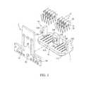 Thecircuit board2 is mounted to themounting surface121 of theassembly frame12, and comprises a plurality of pressingholes21 penetrating through thecircuit board2, a plurality ofconductive traces22 connecting the plurality of pressingholes21, apositioning hole23 penetrating through thecircuit board2, and twonotches24 respectively formed at two opposite sides of thecircuit board2. Themiddle portion122 of theassembly frame12 has apositioning post124 protruding from themounting surface121 and provided through thepositioning hole23; the twoclamp portions123 of theassembly frame12 protrude from themounting surface121 and is formed with twohooks125 corresponding to the twonotches24 of thecircuit board2 in position; distal ends of thehooks125 is bent inwardly to latch on thecorresponding notches24. Distal ends of inner sides of the twohooks125 each form aguide surface126 to allow that the twohooks125 to smoothly engage and latch to thenotches24 when thecircuit board2 and theassembly frame12 are assembled. In operation, thepositioning post124 of theassembly frame12 is positioned into thepositioning hole23 of thecircuit board2 and the twohooks125 and thenotches24 are latched so as to secure the two opposite sides of thecircuit board2. As can be appreciated, theassembly frame12 helps to securely support thecircuit board2 when thecircuit board2 assembled and fixed to themounting surface121 of theassembly frame12. Sides of thepressing hole21 are provided with a conductive plating layer to be electrically connected with theconductive trace22.