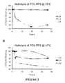 FIG. 2A. Hydrolysis of PEG-PPS at 25° C. over time at various pH values. The polymer was prepared by solvent dispersion from THF. The THF was removed under vacuum prior to the start of the study. Degradation was quantified via gel permeation chromatography, and the peaks for the free PPS and PEG blocks were quantified. At elevated pH (8.4) degradation occurred more rapidly, whereas at pH 5.4 no degredation was observed.