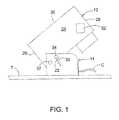 Thebase12 is a substantially box-shaped structure with opposite side surfaces24 spaced from one another by a distance slightly less than the spacing between theside walls18 of thesupport14. The base12 also includes afront surface26, arear surface28 and a top30. Parts of thesidewalls24 near thefront surface26 of the base12 are mounted pivotally to thesidewalls18 of the frame about pivot pins32. The pivot pins32 are disposed substantially concentrically with respect to thearcuate grooves20. The base12 further includes adjustment handles34 projecting out from thesidewalls24 of thebase12. The adjustment handles34 can travel through thearcuate grooves20 as the base12 pivots relative to thesupport14 and can be releasably engaged with thenotches24 when thebase12 is at a desired angular orientation relative to thesupport14.