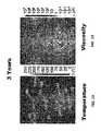 FIG. 10 is a plot of the bitumen production rate versus time for the simulation with a portion of the ramp-up stage indicated at about 3 years.FIGS. 11 to 13 are respectively plots of temperature, viscosity, and gas saturation distributions in thereservoir30 with thefirst pattern200 at 3 years into the simulation.