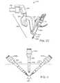 FIG. 18A is a diagrammatic top view, andFIG. 18B is a diagrammatic side view, of still anotherport feature1802 that may be used to guide and support two or more cannulas entering through a single incision. Port feature1802's basic configuration is similar to that ofport feature1702—e.g., the funnel section, front tongue, and channels are generally similar. Inport feature1802, however, backtongue1804 may be rotated from a position aligned withfront tongue1806, as indicated byalternate position1808, to a position opposite the front tongue, as shown inFIG. 18B. Therefore, backtongue1804 may be made relatively longer than back tongue1708 (FIG. 17B), andport feature1802 can still be inserted into a single small incision.Back tongue1804 is aligned withfront tongue1806 whenport feature1802 is positioned in the incision, and then it is rotated to the back position when the port feature is in place. In one implementation,back tongue1804 is coupled to the rotating cylinder that contains the channels, as described above, and atab1810, located inside the funnel section, on the cylinder piece is rotated as indicated by the arrows from itsalternate insertion position1812 towards the front to position the back tongue for surgical use.
