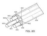 FIG. 8D is a diagrammatic transparent perspective view that shows yet another implementation a flexible instrument shaft design. As shown inFIG. 8D, a push/pull drive element850 extends through acenter channel852 in amulti-channel tube854, which is similar totube834 described above. Three force isolation/stiffening rods856 as described above extend through three of thechannels858 surrounding the center channel. As shown inFIG. 8D, the distal ends of therods856 include stainless steel plugs that fit into the channels. In the depicted implementation, the remaining threechannels860 surrounding the center channel are left open and are used as flush fluid channels. In other implementations, however, other elements may be routed through one or more of thechannels860. The surrounding instrument shaft body tube and skin are omitted from the drawing for clarity.
