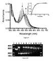 FIG. 5 includes charts showing the UV/Vis absorption of 4 following photoejection in buffer (10 mM phosphate buffer, pH 7.5), where the inset shows the photoejection kinetics.