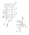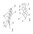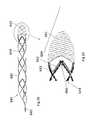 The principles of foreshortening described in relation toFIG. 33 may also be applied to match the foreshortening of the inner and outer elements of the stent baskets disclosed herein, so that their lengths remain similar throughout the range of diameters to which they may expand. Matching the foreshortening minimizes the relative movement of the distal ends of the inner and outer members and facilitates the creation of a connection between the two at their distal ends. A connection may be advantageous to control the position of the inner flow tube within the outer member of the stent basket. However it is not a simple matter to match the lengths of these two members over the full range of diameters. This is because the inner flow tube is designed to expand to a smaller diameter than the outer member. Thus the inner flow tube may be fully expanded and fully foreshortened at a diameter of 1.5 mm for example, while the outer member which may have a fully expanded diameter of 5 mm has only foreshortened by a small amount at a diameter of 1.5 mm. One way of overcoming this problem is to design the outer member so that it foreshortens to the same degree as the inner member at the fully expanded diameter of the inner member, but does not undergo any further foreshortening as it continues to expand from that diameter to its own fully expanded diameter. This unusual foreshortening behaviour can be achieved using the two stage radial force designs described in relation toFIG. 48. Another way to achieve this foreshortening behaviour is to use diamond backbone designs such as shown inFIG. 65 or 98 or 99 and provide the backbone with a stronger opening force than the rest of the member. In this way the backbone can be configured with the same opening angle as the inner member, and can be configured so that it is fully expanded at approximately the same diameter as that of the inner member. Once the backbone has fully expanded the further expansion of the scaffolding sections will have minimal effect on foreshortening.