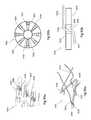FIG. 96 is a cross section ofclot retrieval device9351. In this embodiment struts9357 are arranged in strut-sets9354 whereinter strut space9353 is substantially the same size as inter strut-setspace9355. In this embodiment,eyelet9358 is cut in both struts of strut-set9354 bycut source trajectory9356, which entersfirst strut9361 throughouter surface9352, exitsfirst strut9361 throughfirst cut surface9360, enterssecond strut9362 throughfirst cut surface9360, and exitssecond strut9362 throughouter surface9352. This embodiment has the advantage of orienting the eyelet so that it penetrates the device outer surface and the strut side wall in a direction that is neither normal nor tangential to the device surface. An attached fibre will protrude past the device outer surface and form a substantially acute angle with the surface of the device, which will improve profile relative to conventional processing methods, as well as reduce the sharpness of a bend and therefore the bending stress on the fibre at the eyelet exit point. Additional configurations are possible where strut-set9354 comprise more than two struts and eyelets are cut all of the struts in the strut-set simultaneously. Strut-sets comprising n struts, where n>2 in this configuration will result in n−2 struts having eyelets entirely through the strut side wall.
